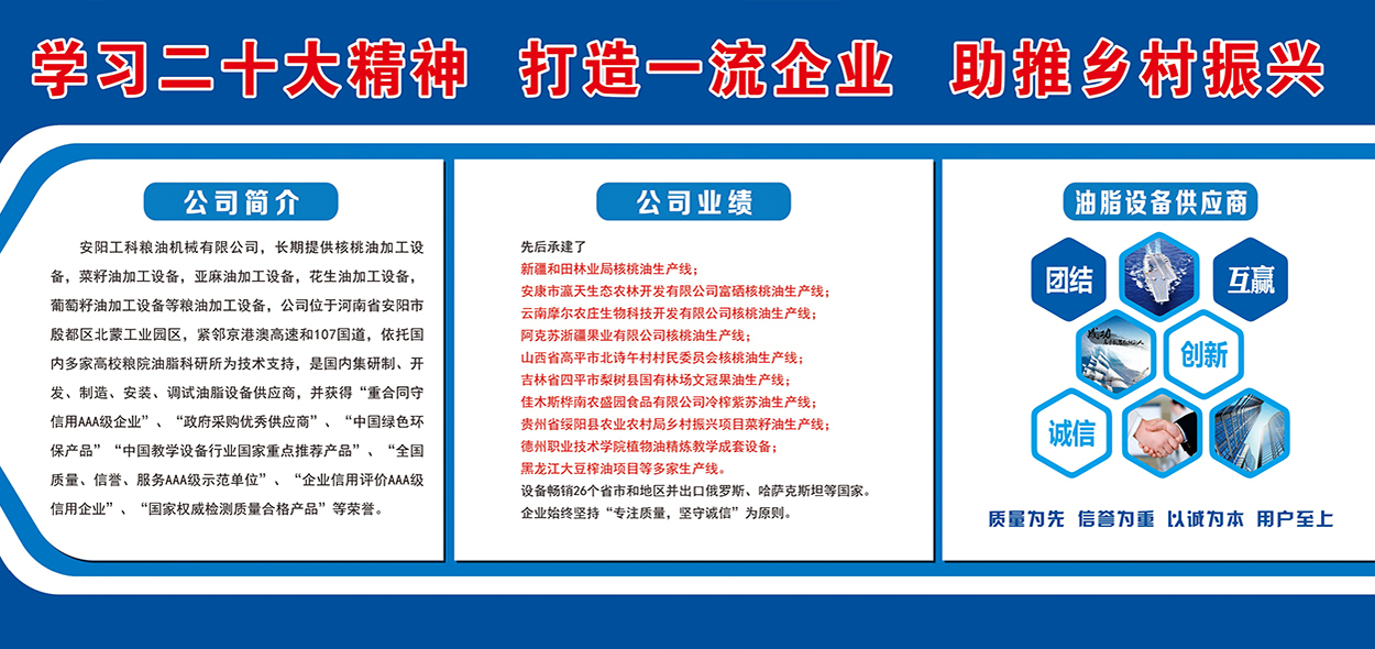 安陽工科糧油機械有限公司,長期提供核桃油加工設(shè)備,茶籽油加工設(shè)備,菜籽油加工設(shè)備,亞麻油加工設(shè)備,花生油加工設(shè)備,葡萄籽油加工設(shè)備等糧油加工設(shè)備,公司位于河南省安陽市殷都區(qū)北蒙工業(yè)園區(qū),緊鄰京港澳高速和107國道,是國內(nèi)集研制、開發(fā)、制造、安裝、調(diào)試油脂設(shè)備供應(yīng)商。先后承建了新疆和田林業(yè)局核桃油生產(chǎn)線,安康市瀛天生態(tài)農(nóng)林開發(fā)有限公司富硒核桃油生產(chǎn)線,云南摩爾農(nóng)莊生物科技開發(fā)有限公司核桃油生產(chǎn)線,阿克蘇浙疆果業(yè)有限公司核桃油生產(chǎn)線,山西省高平市北詩午村村民委員會核桃油生產(chǎn)線,吉林省四平市梨樹縣國有林場文冠果油生產(chǎn)線,,佳木斯樺南農(nóng)盛園食品有限公司冷榨紫蘇油...